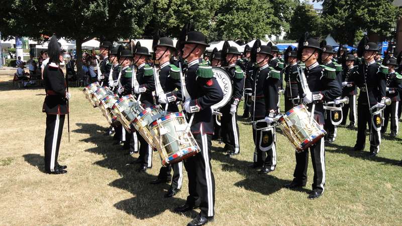 A destination, déjà attendaient quelques centaines de musiciens composant des dizaines de groupes venus du monde entier. Mon dentier, d’ailleurs, et ma bouche en faisaient des ronds de chapeau tant le spectacle était haut en couleur. Les grognards et leur uniforme ne passèrent pas inaperçus au milieu de tant d’autres, surtout des britanniques. Et il faisait chaud, très chaud, mais nous tînmes bon. Il suffisait de ne pas y penser et de boire abondamment. Pour cela, l’eau était distribuée à volonté. Gérard en ambassadeur de la batterie dispensait, ça et là, nos cartes de visite. Parleur avenant et toujours souriant, il connaît la limonade quand il s’agit de promouvoir la BGHA.